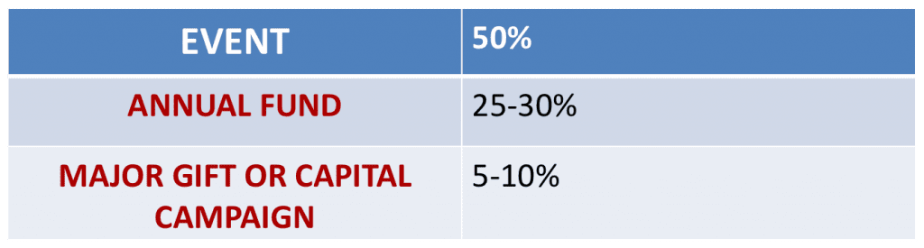Looking at the chart above, compare the costs of raising money with an event that to a mailing campaign like the annual fund – the cost per dollar raised is only $.25-.30 cents on the dollar.